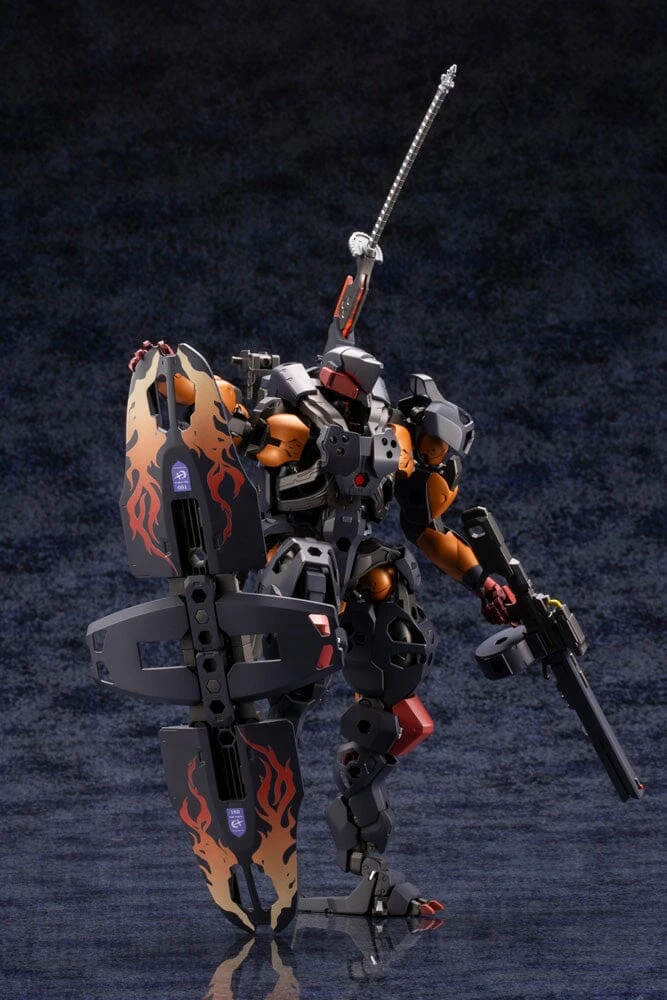 Standing at approximately 206 mm tall, the V-Thor Night Stalker humanoid HEXA GEAR boasts the widest range of motion in the series. The included HD Plasma Cannon can be attached to the mount on the back. The barrel can be replaced to change the cannon into a Gatling gun that fires solid bullets.The Exit Slider equipped on the waist can be removed and combined to make a large physical shield or a high-speed transportation board. Larger than the model itself, the Mega Charged Tactical Sword “Scarlet Blood” can be removed from its sheath. With a total length of 283 mm, this sword is currently the longest melee weapon in the HEXA GEAR series. This kit comes with a special ver. blade as a bonus part. Governors supported are: PAWN A1, PAWN X1, SENTINEL, WARMAGE, and EARLY GOVERNOR Vol. 1. Note that not all governors are supported. This kit includes special joints compatible with the Flying Base Neo (sold separately). The color scheme for this kit is black, gunmetal, metallic orange, red, silver, metallic red, clear red, and metallic clear red