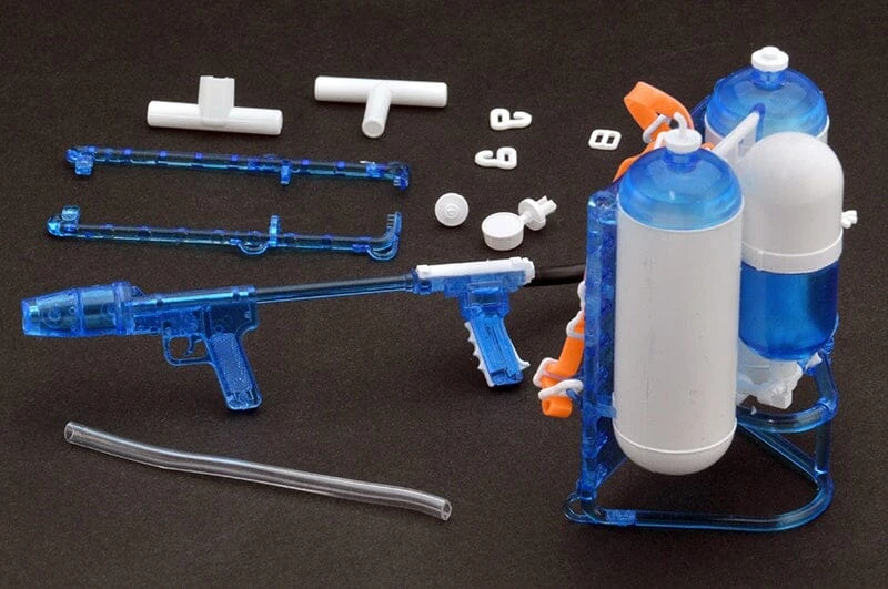 It’s molded in blue and white, with the connecting hose molded in your choice of transparent or black. A set of 3mm mounting parts are included, so it can be easily mounted to the back of any figure equipped with ports of that size; a carrying strap is also included.