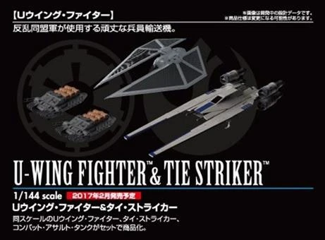 The rebel army’s “U-Wing Fighter” and the Empire’s “Tie Striker” from the new “Rogue One: A Star Wars Story” now comes as a together in this 1/144 plastic model set! The variation of movement in the U-Wing and the Tie Striker’s solar panels have been faithfully recreated. Fine detailing down to the included scale combat assault tanks that appear in the film add more impact to this set. Set includes display stands for both the U-Wing and Tie Striker, laser effect parts for the U-Wing, canopy parts for the U-Wing (frame and clear parts), 2 pilots, 2 1/144 combat assault tanks, and 2 combat assault tank driver parts. Runner x5. Water-transfer decal x1. Sticker sheet x1. Instruction manual x1.