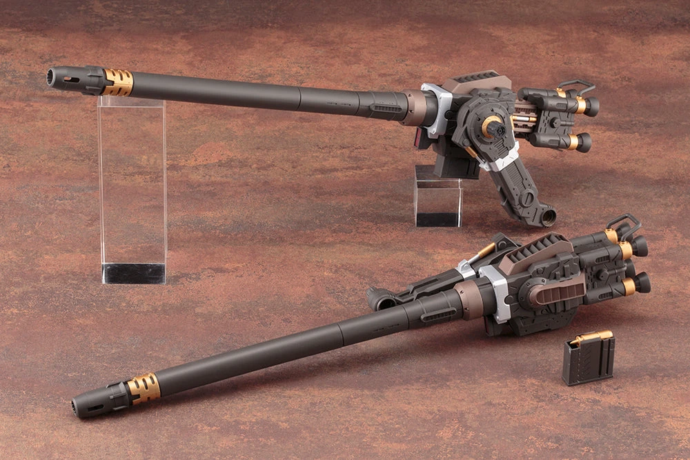This massive kit is the most voluminous of any Kotobukiya plastic model kit up until now. The Long Range Buster Cannons boasts a length of 360mm and have a pullout expansion feature at the rear. For user customization, attachment parts are included so the Long Range Buster Cannons can be attached to other separately sold Zoids (e.g., Blade Liger, Liger Zero). By pulling the sensor part of the 8-Barreled Missile Pods on the torso, the hatches will open. Also, similar to the IRON KONG PK model, the energy cables contain an internal wire that allows for flexible movement. Enjoy the overwhelming power of Gojulas The Ogre, worthy of being called the strongest Zoid.
